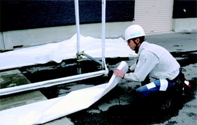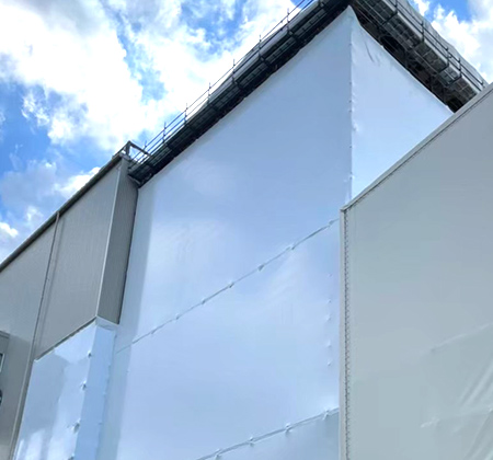 ●シートの密閉度の高さから負圧機の設置も可能。シート継ぎ目を熱溶着することで防塵・防雨・防風にも大変優れており雨による工事のストップや粉塵による近隣様からのクレーム防止にも効果があります。